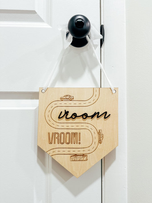Vroom Vroom Wooden Sign | Playroom Banner Sign | Boys Room Decor | Nursery Wall Hanging | Car Transportation Theme Room Decor