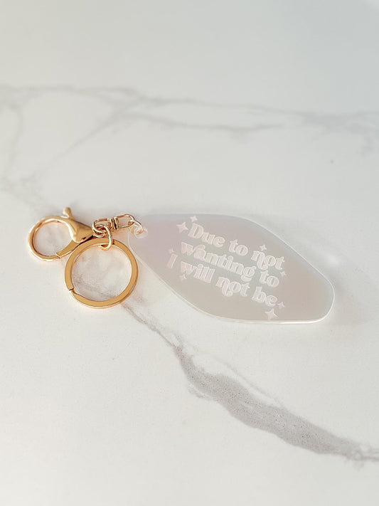 Due to Not Wanting To Keychain | Iridescent Blue Acrylic Motel Keychain | Backpack Tag | Bag Tag | Boho Retro Keychain Tag | Funny Keychain